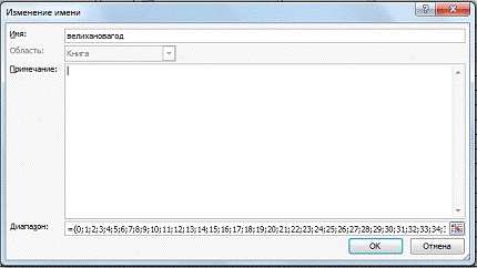 Преобразовываем таблицу в диапазоне С2: AL14 в константу: копируем таблицу ниже, удерживая ПКМ в диапазоне С17:AL14 / выделяем таблицу, и после «=» выделить диапазон первой таблицы / Ctrl+Shift+Enter / на строке формул 2 таблицы нажать F9 / Скопировать запись линейной таблицы / Присвоить имя / В Строке «Имя» ввести фамилию + слово Год, в строку «Диапазон» вставить скопированную линейную запись таблицы.