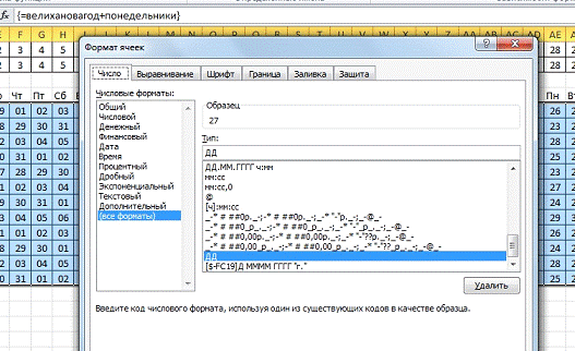Затем нужно суммировать в диапазоне С17:AL14 созданную константу с именованным массивом "Понедельники". Для этого вводим формулу «=велихановагод + понедельники» и нажимаем Ctrl+Shift+Enter.
