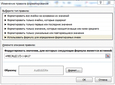 =МЕСЯЦ(C17)<>$A17, и выбираем серый шрифт.