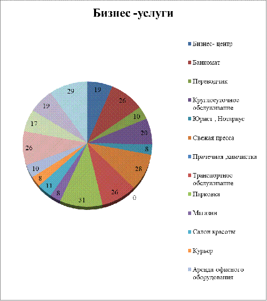 В диаграмме были приведены основные услуги которые предоставляются в бизнес - отелях и отображено число отелей оказывающие такие услуги, из 31 отеля услуги Бизнес - центра оказывают 19 отелей, транспортное обслуживание оказывает 26 отелей, самое многочисленный отрезок на диаграмме -это услуги «Парковки» ,такую услугу предоставляют все приведенные отели., 8 отелей которые предлагают услуги переводчика, услуги юриста и нотариуса.