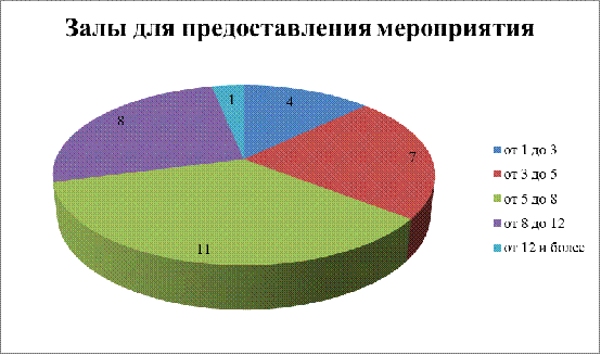 По изображенной диаграмме можно увидеть, что из 31 отель из 11 имеет от 5 до 8 залов для крупных мероприятий, 8 отелей имеют крупные залы от 8 до 12 в общей сложности, из 31 отеля более 12 залов имеет лишь 1 отель, 4 отеля имеют от 1до 3 залов для мероприятий.