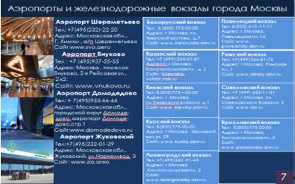 После раздела «Условные обозначения» следует небольшой подраздел ,который называется «Аэропорты и железнодорожные вокзалы Москвы». Это необходимый раздел в журнале , который поможет своей информацией добраться до нужного вокзала и аэропорта, для поиска адреса и телефона не придется тратить время , потому что вся информация указана рядом с названиями .Раздел выделен темно- синим цветом, в котором собраны все главные аэропорты города Москвы, с указанием телефонного номера, фактическим адресом, и информационным сайтом . Так же приведен список всех железнодорожных вокзалов которые собраны в единой табличке с указанием адреса, телефона и сайта ( Рис. 34).