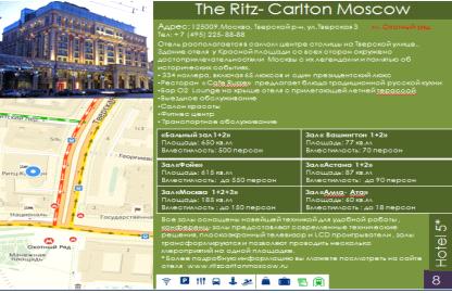 Дополнительно в Гиде - путеводителе также указывается главные площадки где проводятся различные брифинги , семинары, проводятся крупные выставки . На примере гостиницы Ritz Carlton в журнале были дополнительно рассказано про площадки которые находятся рядом с отелей для проведения конференций , была взята информация по площадки Meeting Poing , которая находится рядом с отелем The Ritz Carlton. Meeting Poing - находится рядом с метро «Охотный ряд» - это премиальный бизнес- центр в самом центре Москвы, с современным офисным оборудованием и сервисом, уникальным дизайном и комфортными условиями для работы. Идеальное место для проведения переговоров, конференций , тимбилдингов, семинаров и других корпоративных мероприятий, а так же для индивидуальной работы - на выбор в зоне коворкинга или в личном кабинете. Собственный конференц - зал Red Square позволяет проводить деловые мероприятия любой сложности . По уровню технической оснащенности , комфортности внутреннего пространства и удобства расположения, конференц- зал отвечает самым высоким требованиям к деловым площадкам площадью 85 кв.м позволяет проводить мероприятия с участием до 100 человек , зал имеет собственный вход ,оборудован гардеробной , комнатой для кейтеринга и обслуживанием, а так же отдельной аппаратурой.