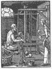 Рис. 14 Ткач на немецкой гравюре 1568 года. Горизонтальный ткацкий станок