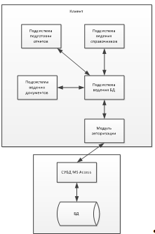Используется концепция файлового сервера, который использует базу данных, представленную в едином файле и организует к нему доступ различных пользователей. На рисунке 2.17. представлена архитектура системы.