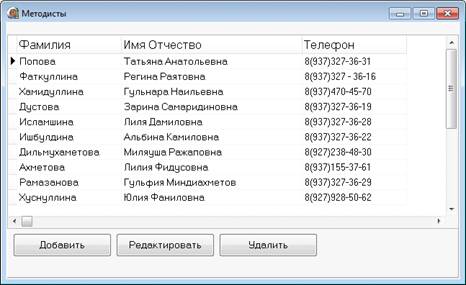 Главное окно программы обеспечивает доступ ко всем функциям. Структура меню программы полностью совпадает с разработанной структурой меню. Работа со справочником Методисты возможна через форму Методисты (рисунок 2.22).