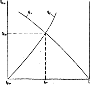 Точка пересечения линий определяет условие стационарности - равенство тепловых потоков.