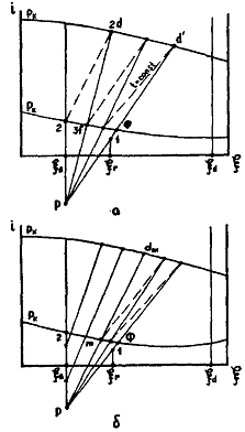 Для выпарного элемента несовмещенного типа (рис.3.3, а) первая коннода для верхнего сечения исчерпывающей колонны изображается прямой 1-Ф-d’. Коннода нижнего сечения куба, где имеется только одна фаза, стягивается в точку 2, через которую проходит ось приведенных энтальпий выпарного элемента. Пересечение первой коннода с этой осью определяет полюс Р для исчерпывающей колонны.