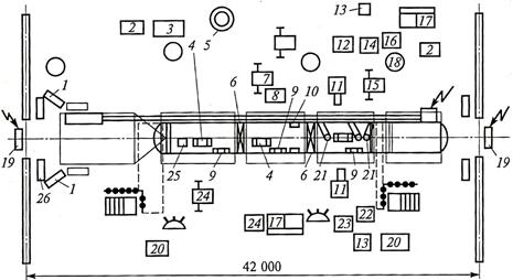- направляющий ролик; 2 - конторский стол; 3 - слесарный верстак; 4 - регулируемые подставки под ноги; 5 - стеллаж-вертушка для крепежных деталей; 6 - переходный мостик; 7 - передвижной пост электрика; 8 - тележка для транспортировки аккумуляторных батарей; 9 - ящик для инструмента и крепежных деталей; 10 - гидравлический передвижной подъемник; 11 - гайковерт для гаек колес; 12 - стол-ванна для промывки фильтров;13 - воздухораздаточная автоматическая колонка; 14 - маслораздаточная колонка; 15 - передвижной пост смазчика-заправщика; 16- маслораздаточный бак; 17 - ларь для обтирочных материалов; 18 - установка для отсоса отработавших газов; 19 - механизм привода ворот; 20 - лари для отходов; 21 - воронка для слива отработавших масел; 22 - установка для заправки трансмиссионным маслом; 23 - передвижной нагреватель смазки; 24 - передвижной пост слесаря-авторемонтника; 25 -гайковерт для гаек стремянок рессор; 26 - установка для тепловой завесы ворот.