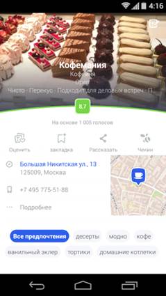 Вы можете искать рестораны, кафе, ночные клубы, магазины и многое другое. Узнавайте, что есть поблизости от вас, или составляйте планы на будущее.