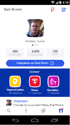Еще одним из ярких представителей социальной активности является МП под названием Foursquare. Характерной его чертой является оставление гео-позиционирования о том месте, где вы побывали. Естественно с последующим обсуждением и социальной активностью пользователями (Рисунок 1.2.4). Вот лишь некоторые функции данного продукта: