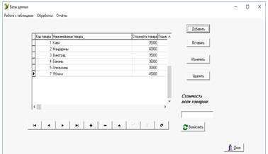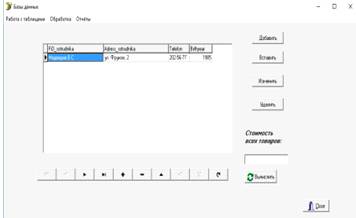 В курсовой работе рассматривается создание приложения баз данных в среде Delphi в соответствии с заданной прикладной областью. Были изучены следующие теоретические вопросы, относящиеся к созданию приложений БД в среде Delphi: утилита DatabaseDesktop, понятие и состояние набора данных, компонент TDBNavigator, компонент TDBGrid, компонент TQuery, оператор Select, агрегатные функции.