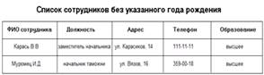 Выдать список сотрудников (ФИО, адрес, телефон, образование, должность), у которых не указан год рождения.