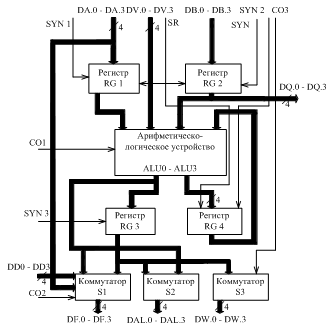 В зависимости от кода на управляющих входах DV и СО1 над содержимым регистров RGI и RG2 в ALU выполняются соответствующие операции (таблица 1.1). В регистр RG3 по срезу сигнала SYN3 записывается результат операции, выполняемой ALU. Возникающий при выполнении арифметических операций перенос может быть записан в RG4 по срезу сигнала SYN4.