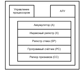 Блок центрального процессора, представленного на рисунке 1.2, содержит 8-битное АЛУ, аккумулятор, индексный регистр, регистр признаков, указатель стека, программный счётчик и управляющую логику. На кристалле так же расположены системы памяти: загрузочное ПЗУ, программируемое ПЗУ и ОЗУ.