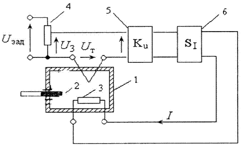 У випадку відхилення температури θ від заданого значення (яке задається величиною напруги U3 встановленої при настроюванні схеми), значення напруги змінюється. Це змінне значення напруги підсилюється в КU раз, відповідно змінюючи значення струму І, який у свою чергу міняє температуру розжарювання нагрівного елемента 3 у термостаті таким чином, щоб температура в термостаті помінялась у сторону відновлення значення U, встановленого при настроюванні схеми.