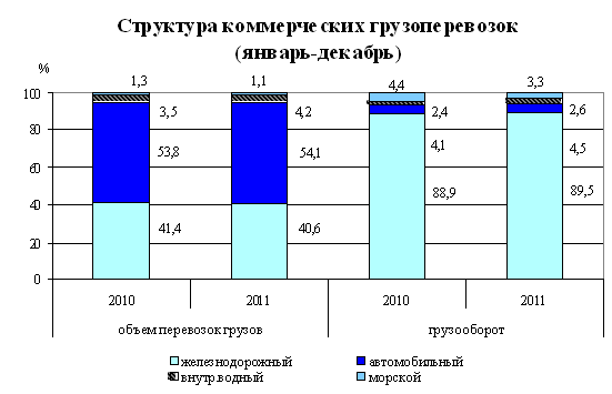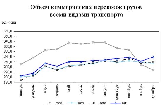 Объем коммерческих перевозок грузов, выполняемых всеми видами транспорта (без трубопроводного и железнодорожного транспорта необщего пользования), в 2011 году составил 3058,8 млн. т (104,9% к уровню 2010 года), а коммерческий грузооборот - 2376,9 млрд. т-км (105,0 ппроцента).