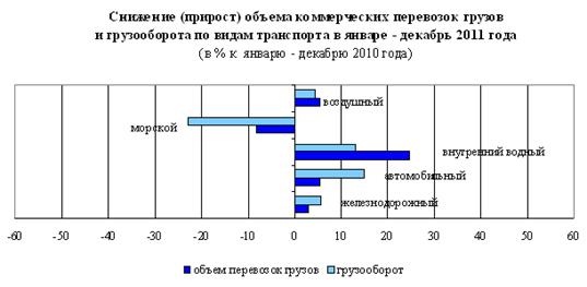 В 2011 году по сравнению с 2010 годом достигнуто увеличение перевозок грузов железнодорожным транспортом на 3,0%, внутренним водным - на 24,7%, воздушным - на 5,5%, автомобильным - на 5,4 процента. Рост объема перевозок на внутреннем водном транспорте за январь-декабрь текущего года относительно аналогичного периода 2010 года обусловлен ростом спроса на строительные материалы.