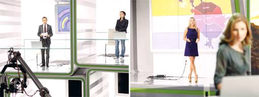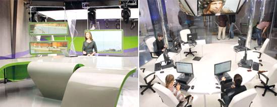 4. Вертикальный двухэтажный ньюзрум. Это идея генерального директора канала Игоря Шестакова. Выполненное в белой гамме, это сквозное пространство представляет собой некие мини-малистичные ячейки-кубы, в каждой из которых работают разные рубрики - афиша, криминал и проч. Эти ячейки придуманы и созданы не просто для красоты, а для того чтобы ведущая могла, не отворачиваясь от камеры, общаться напрямую с коллегами. Примечательно, что ведущий одной из рубрик сам является режиссером своего блока новостей, у него есть специальный пульт, и он сам запускает порядок слайд-шоу и решает, в какой последовательности и о чем расскажет. Это ноу-хау канала - ведущий сам запускает свой эфир, и это более эффективно, поскольку психологически придает больше уверенности, и создается ощущение, что человек в материале - он творит при нас и для нас специально. Суфлер отсутствует, ведущие рассказывают по памяти. Этот формат больше похож на презентацию - информация подается вживую, в отличие от официального телевидения, где все выверено до запятой. И это существенное отличие от обычной записной истории, в некотором смысле это другое телевидение.