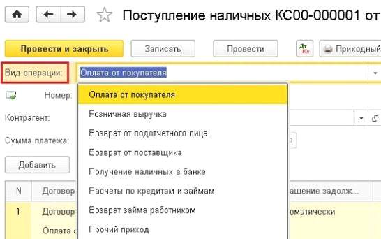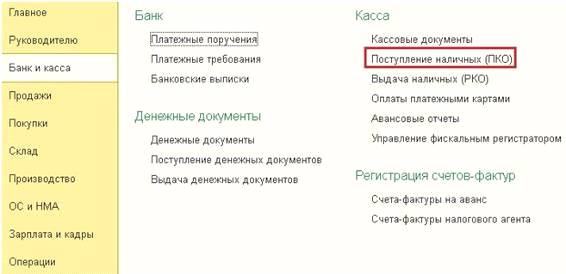 выбрать пункт "Поступление наличных (ПКО)". На Рисунке 1 показана