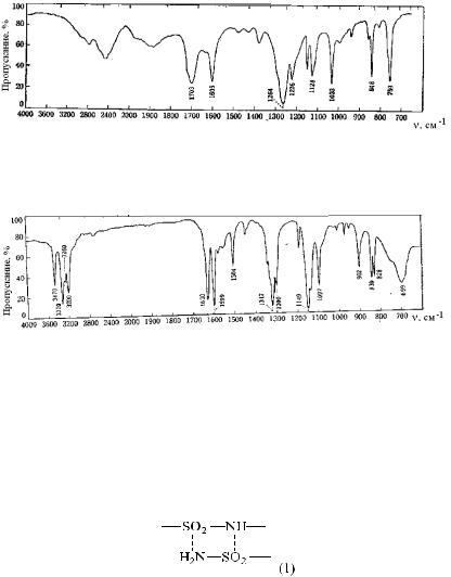 Решение. Как видно из ИК-спектра в соединении имеется первичная аминогруппа (сложное поглощение в области NH), бензольное кольцо (вероятно, пара-замещённое) и сульфаниламидная группа (1317 и 1149 см-1); 3470 и 3320 см-1: νNH аминогруппы; 3200 и 3260 см-1: νNH сульфаниламидной группы. Монозамещенный RS02 – NHR’ имеет две узкие полосы в CC14: при 3390 см-1 (свободная NH) и 3270 см-1 (связанная NH). Последняя существует в растворе с концентрацией 0,001 М. Такое поведение объясняется сильными водородными связями, показанными ниже (1).