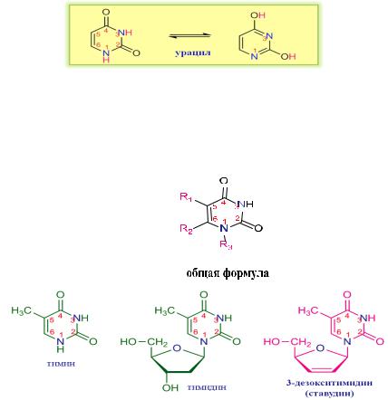 Лекарственные вещества, производные урацила, могут содержать в молекуле атом фтора (R1), метильный радикал (R1 или R2). Некоторые из них представляют собой пиримидиновые нуклеозиды – синтетические аналоги входящих в состав нуклеиновых кислот производных пиримидинового основания – тимина. Они содержат в молекуле остаток моносахаридов (R3) и являются производными 3-дезокситимидина: