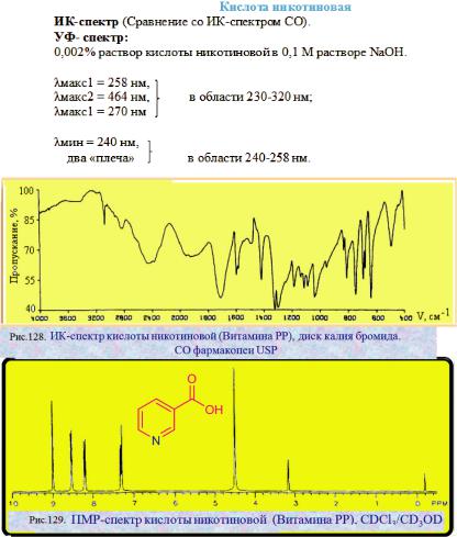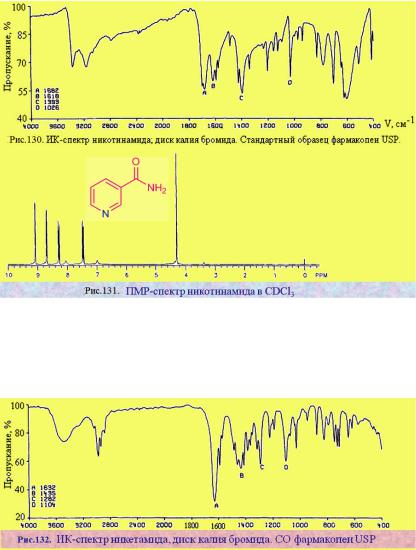 Испытания подлинностипроизводных кислоты никотиновой выполняют с использованием данных УФ-, ИК- и ПМР-спектров (см. рис.128 и 129) .