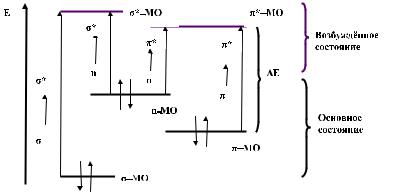 Поглощение света молекулой осуществляется избирательно: поглощаются те кванты света, энергия которых равна разности энергий (∆E) между орбиталями основного и возбуждённого состояний (см. рис. 2). Чем меньше эта разность, тем больших длин волн поглощается свет. Наибольшая энергия требуется для осуществления σ→ σ* электронного перехода. Поэтому соединения, у которых имеются только σ-связи, например алканы и циклоалканы, не поглощают свет в рабочем интервале серийных УФ-спектрофотометров (200-800 нм). В связи с этим они могут использоваться в качестве растворителей при снятии УФ-спектров других соединений. Аналогичное применение находят насыщенные соединения, содержащие гетероатомы с неподеленными парами электронов (О, N, S, галогены). Хотя в их спектрах возможно проявление n-σ* перехода, максимум поглощения в таких соединениях, как спирты, простые эфиры, хлоралканы все же не превышает 200 нм.