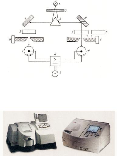 соответственно; 6, 6’ – щелевые диафрагмы; 7, 7’ – фотоэлементы; 8 – усилитель; 9 – нуль-индикатор