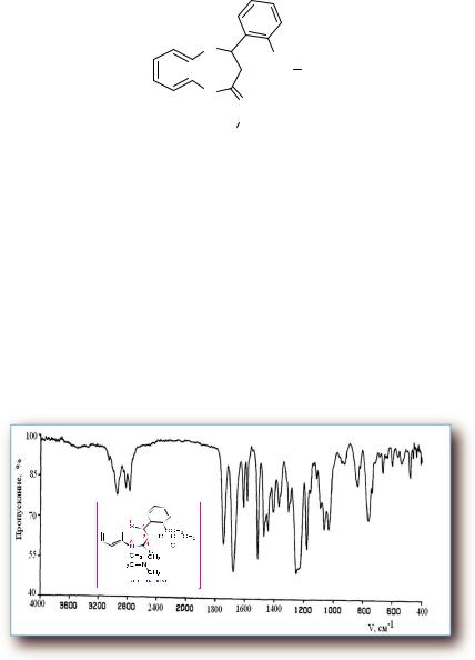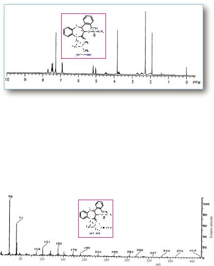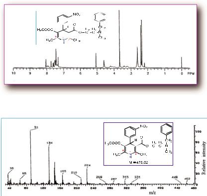4 пиридинового цикла проявляется в виде синглета при 5,05 м.д. (1Н), а сигналы протонов ароматических циклов обнаруживаются в интервале 7,20-7,80 м.д. (9Н). Уширенный сигнал при 7,9 м.д. (1Н), очевидно, принадлежит протону NH группы. Результаты анализа сиг - налов в ПМР-спектре никардипина полностью согласуются с данны - ми его масс-спектра, в котором четко проявляется молекулярный ион m/z = 479,54.