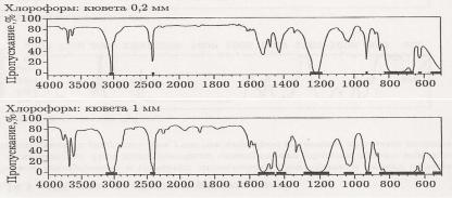 Низкое пропускание в областях поглощения растворителя может приводить к искажениям. При интерпретации спектров эти области нужно исключать. На следующих рисунках эти участки спектров отмечены темными полосами.
