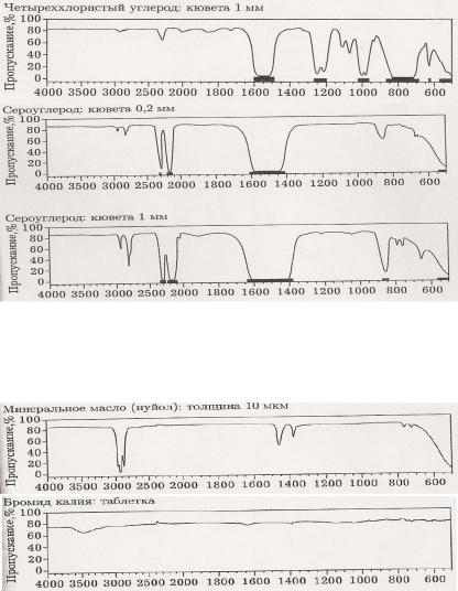 Из-за трудности приготовления таблеток и тонких пленок минерального масла воспроизводимой толщины полосы поглощения этих матриц (для суспензий) всегда налагаются на спектр пробы.