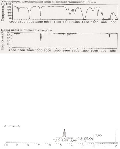 Следы воды в четыреххлористом углероде или хлороформе могут проявляться в виде двух полос вблизи 3700 и 3600 см-1 и одной полосы в области 1600 см-1. При повышении концентрации воды наблюдается широкая полоса около 3450 см-1. Пары воды проявляются в виде многочисленных узких полос между 2000 и 1280 см-1. При более высоких концен-