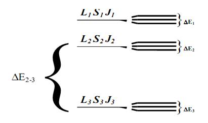 Набор этих чисел записываются в следующем виде - 2S+1LJ. Например, для основного состояния иона неодима 4I9/2, что означает S=3/2, L=6, J=9/2. Из квантовых чисел можно так же определить количество подуровней на которые данный энергетический уровень расщепился. Количество подуровней будет равно S+1/2. Например, для уровня 4I15/2 количество подуровней будет равно 8. Неоднородное и однородное уширение. Спектры поглощения и люминесценции кристаллов, активированных ионами редкоземельных элементов, состоят из отдельных групп узких линий. Каждая группа представляет собой штарковскую структуру, возникающую из-за расщепления атомных уровней основного и возбуждённого состояний, характеризуемых моментами J и J'. Таким образом, группе приписывают оптический переход в свободном атоме S,L,J → S',L',J', с которым она связана генетически. Если сравнить спектры одного и того же РЗ иона в разных кристаллах, то окажется, что число линий в S,L,J → S',L',J' группе, характер их расположения и относительные интенсивности различны. Эти характеристики связаны с особенностями ближайшего окружения РЗ иона (строением РЗ центра). Анализ штарковской структуры спектра позволяет получить информацию о строении оптического РЗ центра, в частности, определить его симметрию. В спектрах стёкол в тех же диапазонах частот, где в случае кристаллов имеются группы узких линий, наблюдаются размытые полосы с более или менее выраженными максимумами. Они выглядят так, как если бы линии спектра кристалла увеличили ширину, оставаясь на прежнем месте, и частично наложились друг на друга. Типичные значения ширины линий для перехода между парой отдельных штарковских уровней в случае кристаллов ≈10 см-1, в случае стёкол ≈100 см-1.
