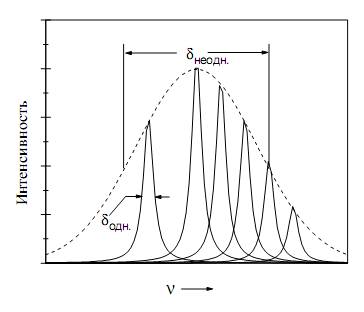 Таким образом, в стекле каждый из РЗ ионов находится в своём специфическом поле, которое отлично от полей, действующих на другие ионы. Строго говоря, все оптические центры различны, а значит, у них различаются штарковские расщепления уровней и штарковская структура спектров. Спектр, наблюдаемый в условиях обычного эксперимента, есть результат наложения спектров отдельных центров (рисунок6). Понятно, что такое наложение проявляется в виде уширения спектральных линий.