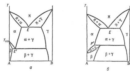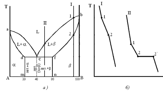 компонентов в твердом состоянии; б) - кривые охлаждения типичных сплавов