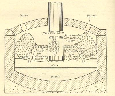 подплавляет шихтовую кучу и охлаждается. Более холодный шлак имеет большую