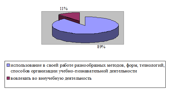 Третий вопрос анкеты звучал следующим образом: «Как, по вашему мнению, можно более эффективно формировать коммуникативную компетенцию у учащихся?» большинство учителей (89%) отметило использование в своей работе разнообразных методов, форм, технологий, способов организации учебно-познавательной деятельности», а 11% считает, что необходимо вовлекать во внеучебную деятельность» (см. Рис.4.).