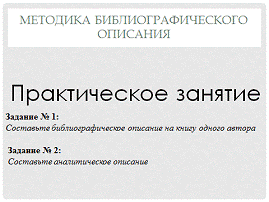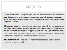 Одноуровневое библиографическое описание - содержит один уровень. Его составляют для описание книг, брошюр и других разовых однотомных изданий, а также отдельных томов (выпусков) многотомного или сериального издания или многотомный документ в целом.