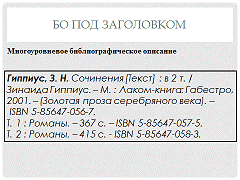 Многоуровневое библиографическое описание - содержит два или более уровней. Его составляют для описания многотомных или комплектных документов в целом, (сериальный или другой продолжающийся ресурс в целом) либо на один или несколько томов (выпусков, номеров, частей) многотомного, комплектного документа, сериального или другого продолжающегося ресурса.