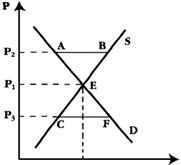 При более высокой цене Р2 возникает избыток предложения над спросом (равный по величине отрезку АВ). Этот избыток в результате конкуренции продавцов будет способствовать снижению цены. При цене ниже уравновешивающей (Р3) спрос превышает предложение (отрезок CF) и возникает дефицит товара на рынке. В этом случае излишек спроса и конкуренция покупателей будут толкать цену вверх. Лишь в точке E достигается равновесие сил и устойчивая цена, которая может сохраняться в краткосрочном периоде, пока не изменятся какие-либо параметры, определяющие спрос и предложение.