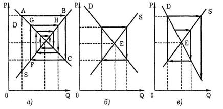 равновесие в паутинообразной модели и регулярные колебания (б) вокруг него