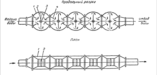 На рис.3 представлено схематическое устройство напорной обеззараживающей установки, состоящей из нескольких (двух-пяти) камер 1, по которым последовательно проходит обрабатываемая вода. В каждой камере установлена ртутно-кварцевая лампа 2, заключенная в цилиндрический кварцевый кожух 3. Вода, попадая в камеру, направляется радиально расположенными перегородками 4, обеспечивающими ее перемешивание и прохождение вблизи ламп.