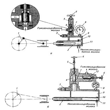 а-одноступенчатой; б-двухступенчатой, 1-кривошипно-шатунный механизм; 2-плунжерный насос; 3- предохранительный клапан; 4,12-гомогенизирующие клапаны первой и второй ступеней; 5-пружина; 6-регулировочные винты; 7-седло; 8-манометр; 9-нагнетательная камера; 10, 11 - нагнетательный и всасывающий клапаны