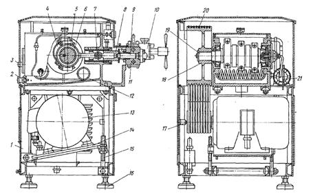 -станина; 2-сливная пробка; 3-маслоуказатель; 4-кривошипно-шатунный механизм; 5-шатун; 6-вкладыш; 7-палец; 8-ползун; 9-плунжер; 10-гомогенизирующая головка; 11-плунжерный блок; 12-змеевик; 13-электродвигатель; 14-плита; 15-устройство для натяжения ремней; 16-опора; 17-шкив ведущий; 18-шкив ведомый; 19-коленчатый вал; 20-клиновой ремень; 21-маслонасос