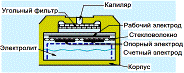 В процессе работы газ проникает в ячейку через капилляр и фильтр, и