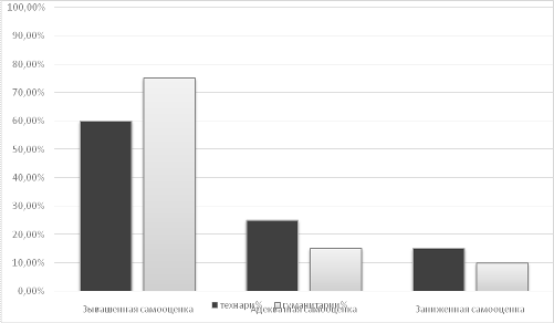 Если в результате обработки правой колонки получится число от 0 до 0,3, то это свидетельствует о пониженной самокритичности; возможно завышенной самооценке; от 0,3 до 0,5 - о нормальной самокритичности и самооценке; от 0,5 до 1 - о повышенной самокритичности, заниженной самооценке. Анализ результатов исследования (рис.1.) показал, что завышенной самооценкой обладают 75% "гуманитариев" и 60% "технарей", адекватная самооценка прослеживается у 15% "гуманитариев" и 25% "технарей". Самый маленький процент приходится на долю заниженной самооценки: заниженная самооценка наблюдается у 15% "технарей" и у 10% "гуманитариев".
