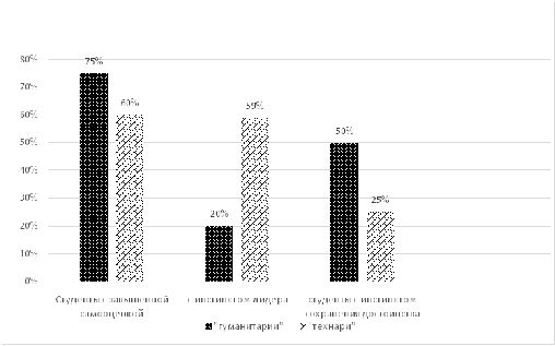 1) Завышенная самооценка наблюдается у 75% "гуманитариев" и 60% "технарей";