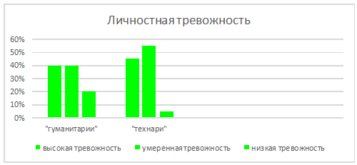 На рис. 6. представлены результаты по определению личностной тревожности "гуманитариев" и "технарей". Мы видим, что: