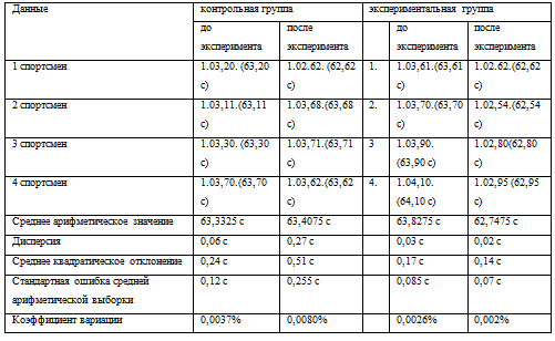 Проанализировав результаты, полученные в ходе исследования с помощью методов математической статистики, вычислили такие показатели как среднее арифметическое значение, дисперсию, среднее квадратическое отклонение, стандартную ошибку средней арифметической выборки и коэффициент вариации. Из данных показателей следует, что действительно, по всем показателям экспериментальная группа доказывает гипотезу, поставленную в данной дипломной работе - использование различных методов и средств восстановления работоспособности у пловцов в группах спортивного совершенствования эффективно повышают результативность на учебно-тренировочных занятиях и соревнованиях различного уровня.
